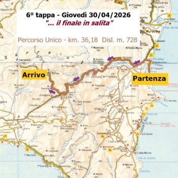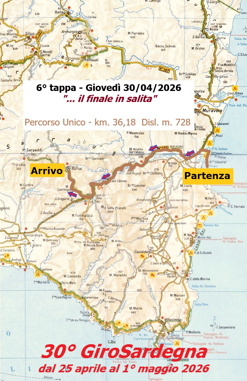Continua la tradizione del GiroSardegna di fare una tappa finale breve ma con l’arrivo in salita: è un’ultima possibilità che viene data agli scalatori di sovvertire le classifiche finali ma è anche l’opportunità di staccare di pochi metri colui che è rimasto incollato alla ruota per cinque tappe!! Seppure il percorso è unico, la partenza della gara avviene comunque in tempi separati e le griglie sono sempre due, MedioGiro e GranGiro. La strada è quella che attraversa le Gole del Riu Cannas fatta in discesa il giorno prima ma ora la si affronta in salita, poi si continua a salire fino a Burcei.